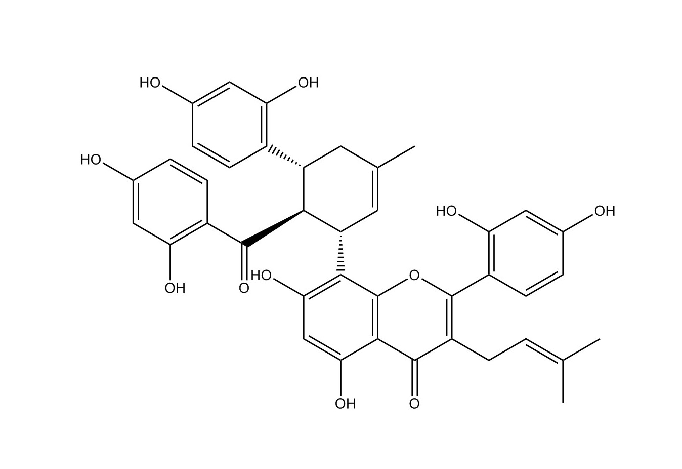 【英文別稱】 8-[(1S,5R,6S)-6-(2,4-dihydroxybenzoyl)-5-(2,4-dihydroxyphenyl)-3-methylcyclohex-2-en-1-yl]-2-(2,4-dihydroxyphenyl)-5,7-dihydroxy-3-(3-methylbut-2-enyl)chromen-4-on